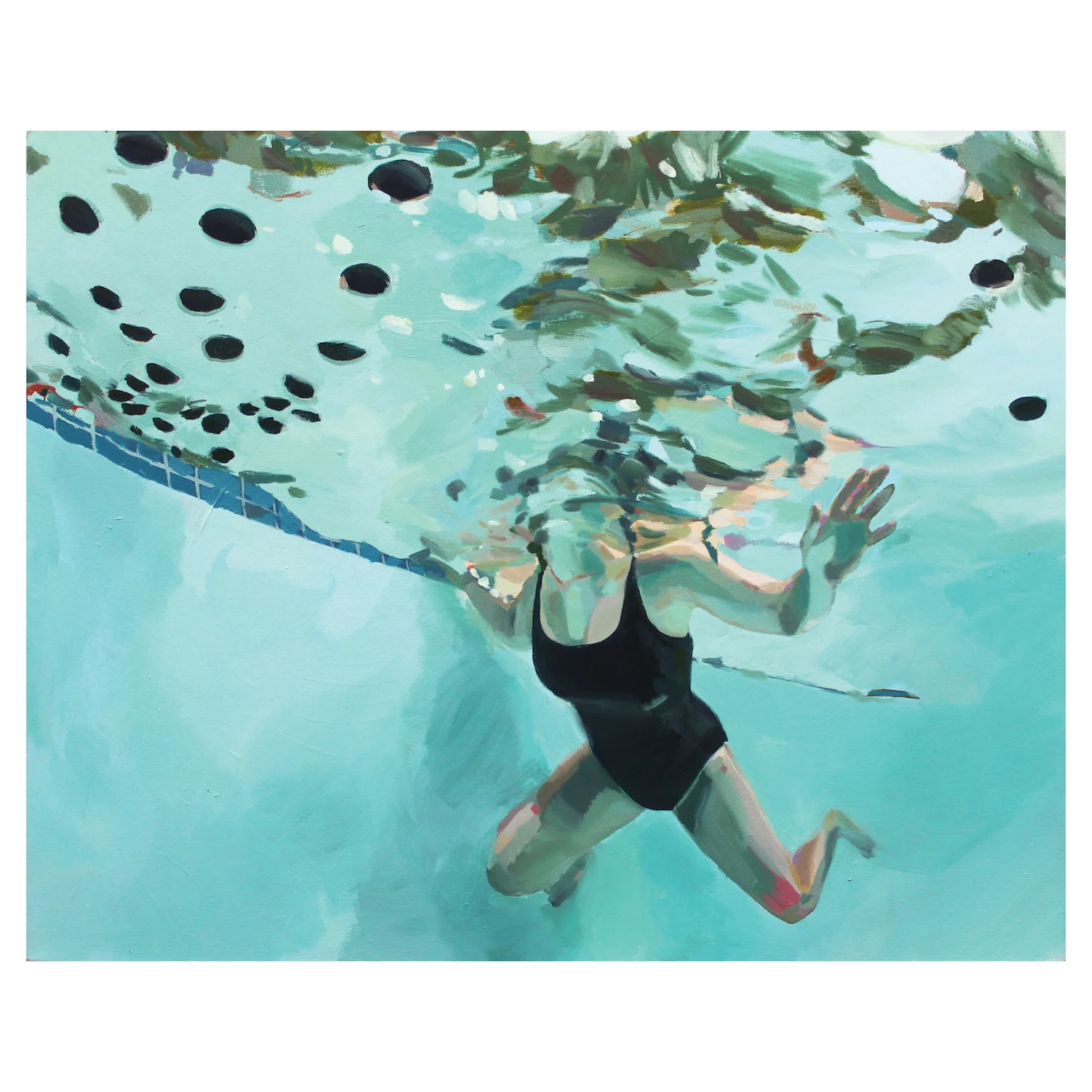 The artists painted thousands of small spheres to look like a starry universe and set them afloat in a pool. Viewers could dive in and out of the universe, sending galaxies spinning with each gesture. This painting is part of a series which uses video stills from this performance as reference images.